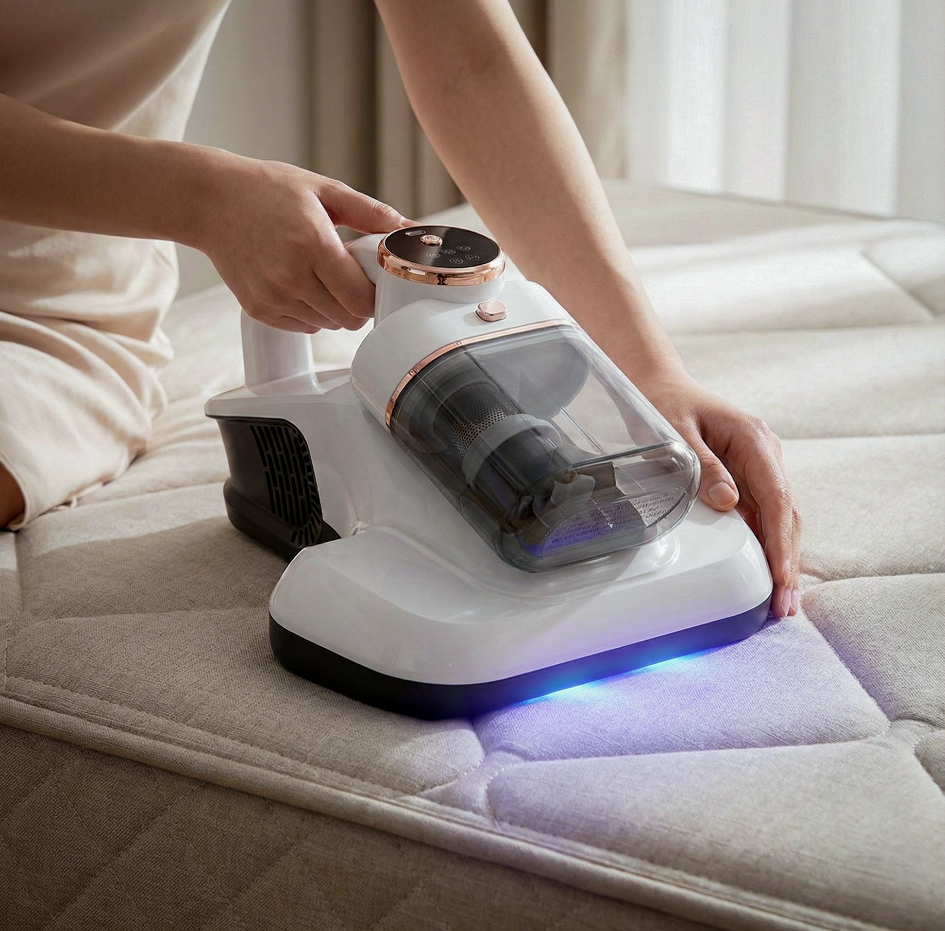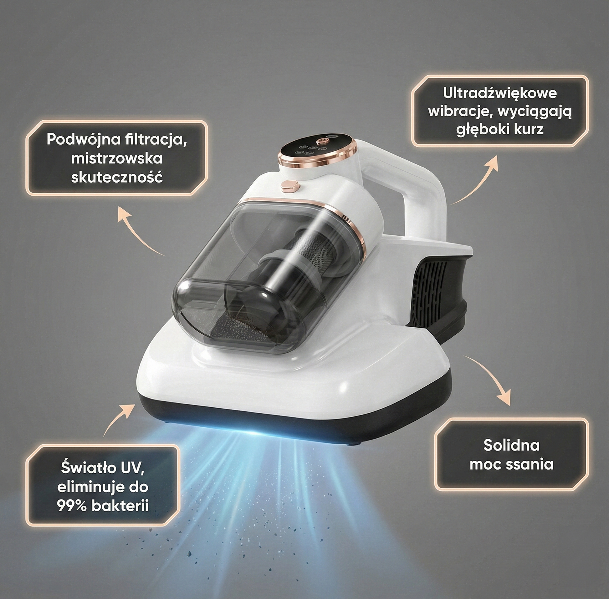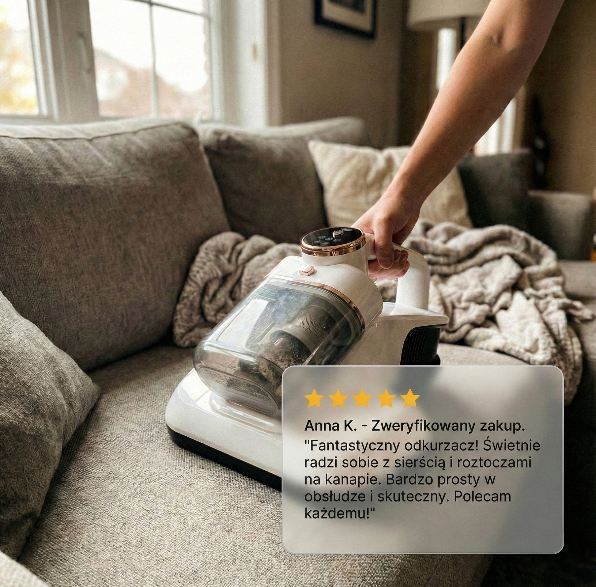 MiteVac™ eliminuje 99.9% roztoczy, alergenów i kurzu. Poczuj różnicę już pierwszej nocy dzięki technologii UV-C i ultradźwięków.